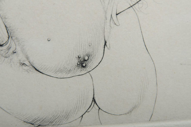 One of a series of 10 erotic sketches, produced late in Bellmer’s career as an artist but typical of his post-war production that moved away from sculptural dolls and towards more explicit pornographic imagery and 2d representation. ‘A Sade’ is loosely inspired by Marquis de Sade and Bellmer’s admiration for the acts of violence in conjunction with desire committed by the noble, the plates commonly depicting faceless masses writhing in an orgiastic, polymorphic combination; genitalia often the only common representational reference within the twisting shapes conjured in delicate drawing. Ten etchings (framed separately); Each signed and noted E.A.; 7 3/4" x 5 1/2" (plate,each); 8 7/8" x 6 3/8" (sight, each); Provenance: Lerner-Misrachi Gallery, New York; Estate of Ronald K. De Long, Pennsylvania