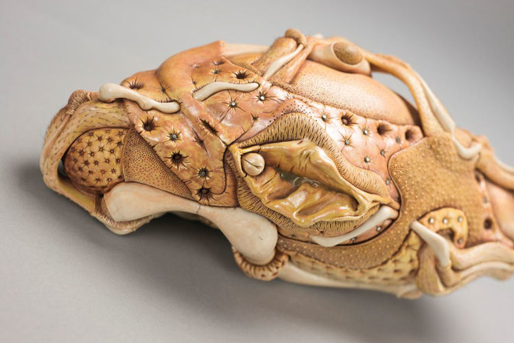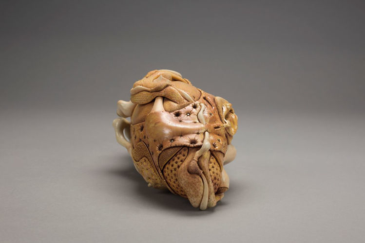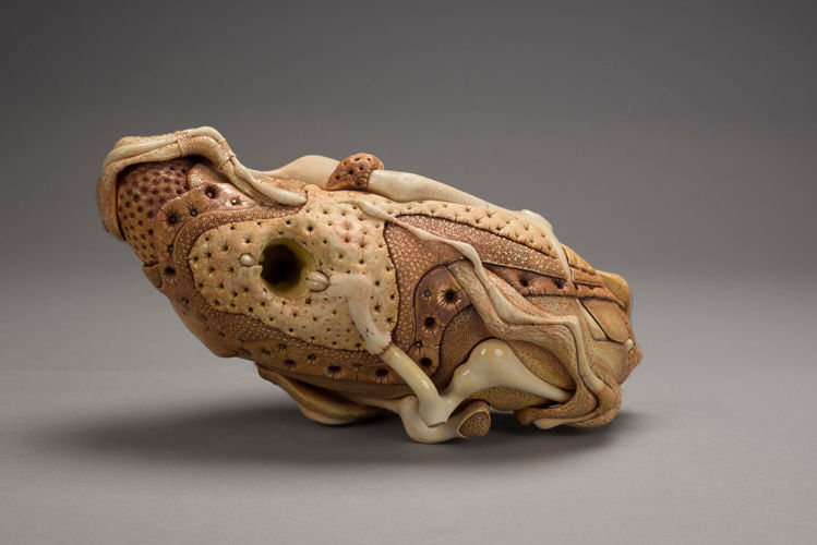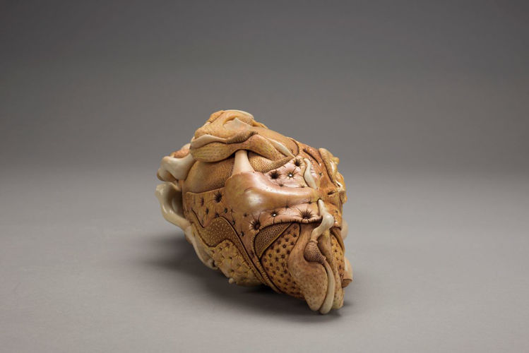 Briggs’ ceramics are formulated uniquely to appeal to our senses of attraction and revulsion. Textural hyper-realism is combined with surreal or nightmarish combinations of form, the biomorphic forms accessing subconscious recesses to discuss notions of sexuality, curiosity and psychology. ‘Ages’ is a particularly complex form, a tight knot of fabric, flesh and unquantifiable matter (all ceramic) that appeals to our sensation to touch — and the horror of what might be discovered.