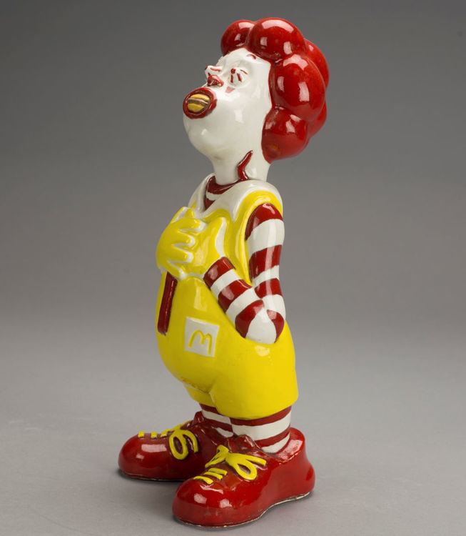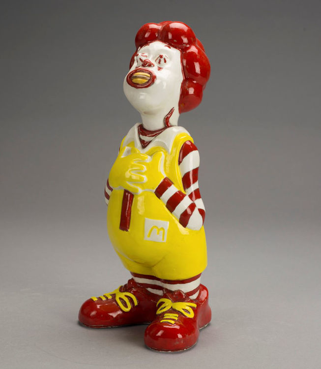 ‘All You Can Eat’ seems at first to simply to characterise the familiar corporate clown of McDonalds, the hand on heart gesture a token of sentimentality for such cherished customers. Biles’ political ceramics are rarely so sympathetic though, and the inscription “McHeartAttack” carved and hidden at the base of the figure might reveal the real reason that Ronald’s eyes bulge.