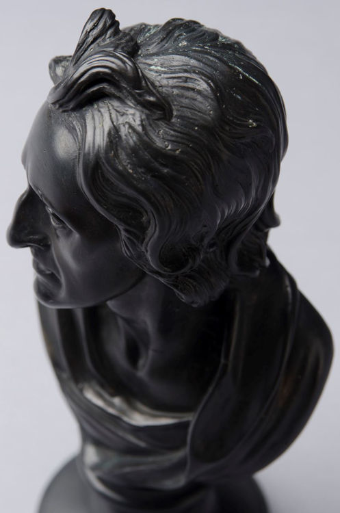 Wedgwood & Bentley Black Basalt Bust of Locke, England, c. 1780, modeled with a stovepipe back and mounted atop a waisted circular socle, impressed title and mark Library bust of the philosopher, leading member of the Enlightenment movement, and “father of liberalism” John Locke — completed by Wedgwood & Bentley in Wedgwood Black Basalt stoneware circa 1780. The bust, mounted atop a waisted circular socle, faces downwards so as to be placed upon a high pedestal.