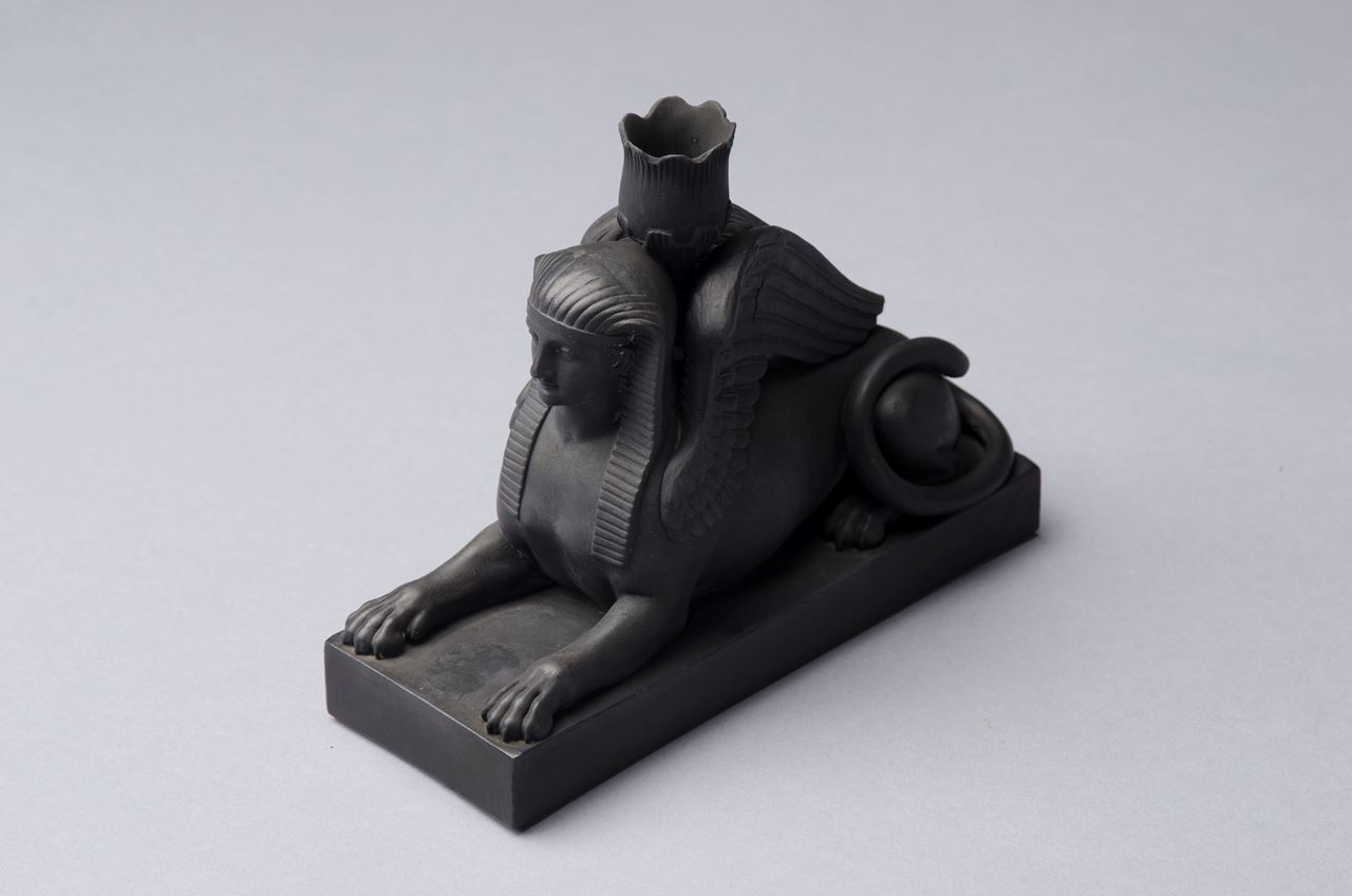 Pair of Wedgwood Black Basalt Sphinx-form Candlesticks, England, early 19th century, each with a scalloped-edge candle nozzle mounted atop the back of the seated figure set on a rectangular base, impressed mark Early 19th century sphinx-form candlestick pair, completed in the signature Wedgwood black basalt. Each of the seated figures sits atop a plain rectangular base, the scalloped candlestick chamber resting just behind the head and between the wings to create a balanced and tapered silhouette. This is one of many examples of Wedgwood’s indulgence in recreating classical or historical examples of ceramic and sculpture, and through the periods of the 18th and 19th century the reoccurring sphinx could interchangeably be Greek or Egyptian in origin — or even both, as often the differing cultures were indistinguishable by scholars & collectors of the time.