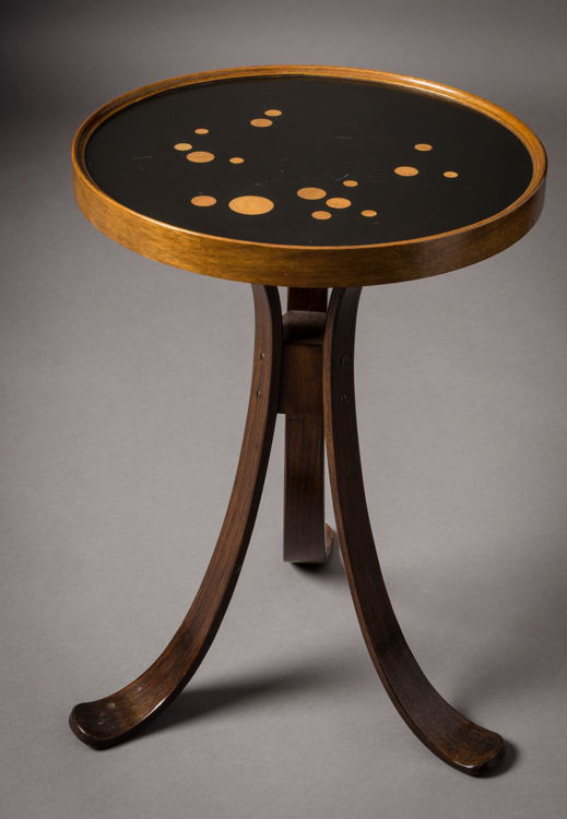 Constellation occasional table with circular wood inlays to black lacquered top on molded walnut base.