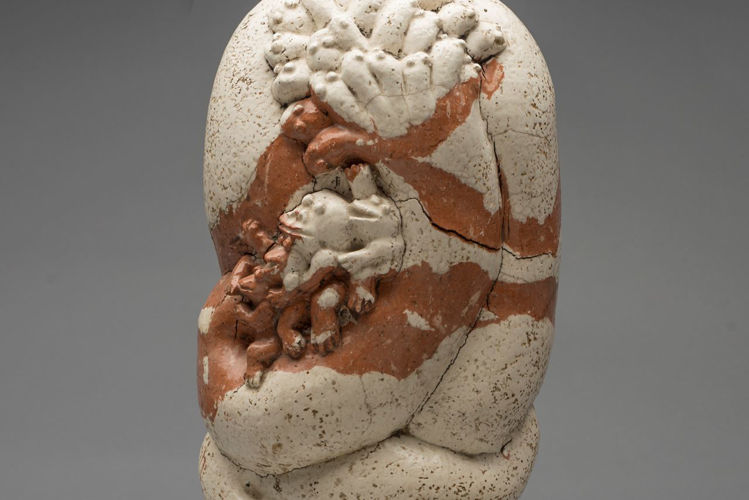 The kitsch, frog-obsessed funk ceramics of Gilhooly grew from attempts to out-grotesque contemporaries — but gradually came to embody the levelling of art through absurdist parodies of 'high-brow’ civilisation and culture. The semi-abstract “Cosmic Egg” takes the literal form of a long oblong egg, but also seems to be manipulating a heavily compressed figurative representation. The marble-like glaze infers classical sculpture, and manifold rounded lumps suggest limbs tied in knots and squashed, fetus-like, into shape upon its pedestal. Two horizontal stripes of darker glaze add to the surrealness with painterly effect.