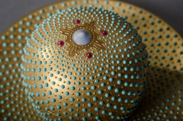 Jeweled Coalport Porcelain Covered Inkwell and Stand, England, late 19th century, with insert pot, globular pot and cover with simulated opal center bordered with rubies, pot, cover and stand allover gold ground with turquoise enameled jeweling, printed crown mark, saucer dia. 4 1/2, inkwell ht. 2 1/8 in. 3-4 jewels with pitting to pot, none missing.