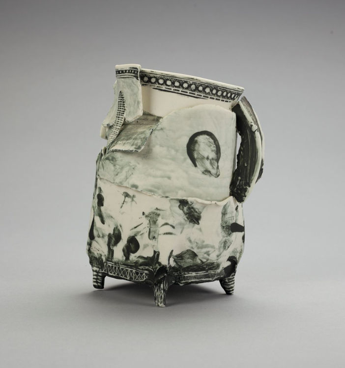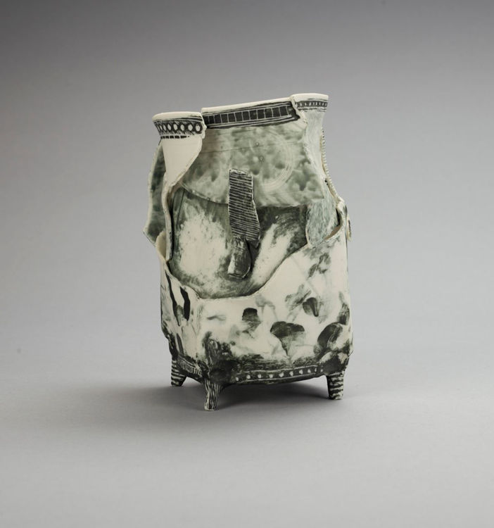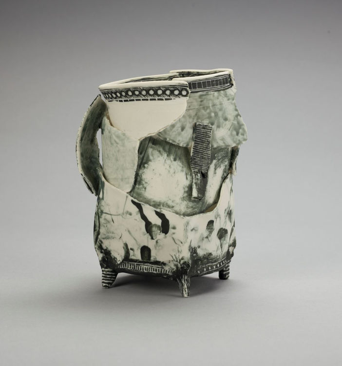 Destruction as an act of creation, ‘Deconstructed Cup’ removes and then rebuilds its purpose to reflect the temporality of a vessel. Ederle frequently works in architectural terms with his thrown pots, working at an elemental level to reveal “inner truths” and using uneven or broken shapes to develop consciously hidden or unexpected results. The works classical motif and simple interplay of white clay and terra sigellata recalls Greek white-ground pottery.