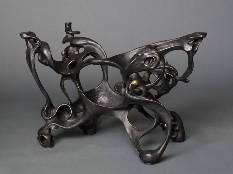 Blackman Cruz Workshop USA, 2008 patinated and highlighted bronze, starfire glass With a narrative of coils or tentacle-like movement and fluidity, Cruz’s “Deliquescent Dining Table” balances grace and poise with a brash and vaguely uneasy exotic estrangement. A use of shell or wavelike motif seems referential to the stylings of Rococo and Baroque furniture, and the overall form takes on a figural silhouette not altogether removed from the kind of mythical winged lion or gryphon commonly seen within those eras. Such flamboyance is offset and balanced by the dulled patina applied to the surface of the bronze, and the sleek contemporary starfire glass tabletop. This is number twenty-six of an edition of fifty from the Blackman Cruz Workshop. The Blackman Cruz Workshop Deliquescent table has its roots firmly planted in the jocular stylings of the Rococo. The table presents a graceful fluidity that exudes sculptural confidence. Its unending shell-like curves that highlight the unique patina of this example underline the flamboyant nature of the piece. Louis XV would have been proud. - Adam Blackman This work is number twenty-six from the edition of fifty. Stamped with manufacturer's mark and numbered to base: [Blackman Cruz 26/50]. ***RESHOOT?