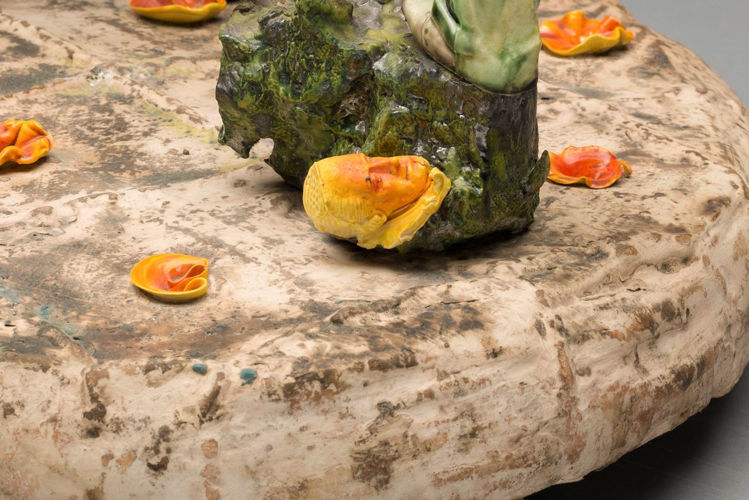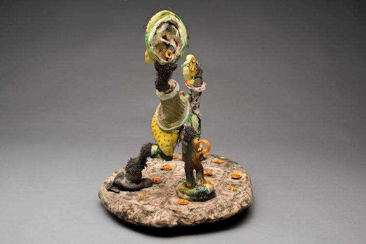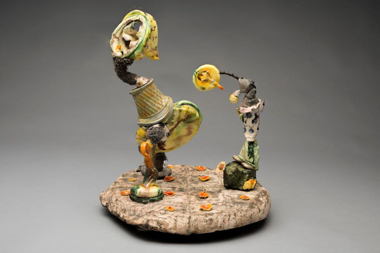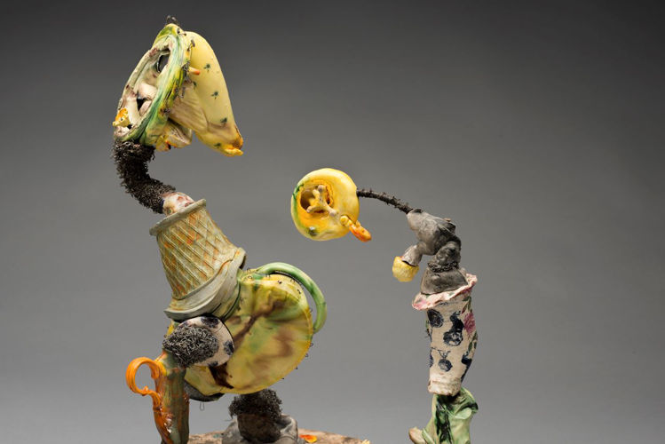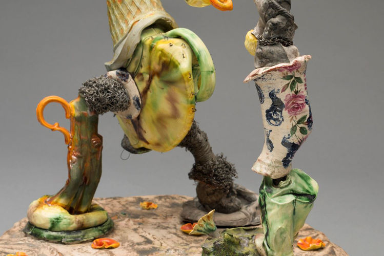 Brownsword’s ceramics are strange, otherworldly obsessions, collaging a process with clay that celebrates a fragmented, morsel-like approach over single resolved works — a reaction to years working in the production line at the Wedgwood factory in Stoke. ‘Don’t Let The Little Head Rule the Big Head’ finds the artist at his most figurative, forming his chemical offcuts of clay into rawly expressive narrative. Works from this period had begun to slyly reference exterior relationships, and here Brownsword has acknowledged a colleagues’ juggling of married life and ongoing infidelities as the oblique subject.