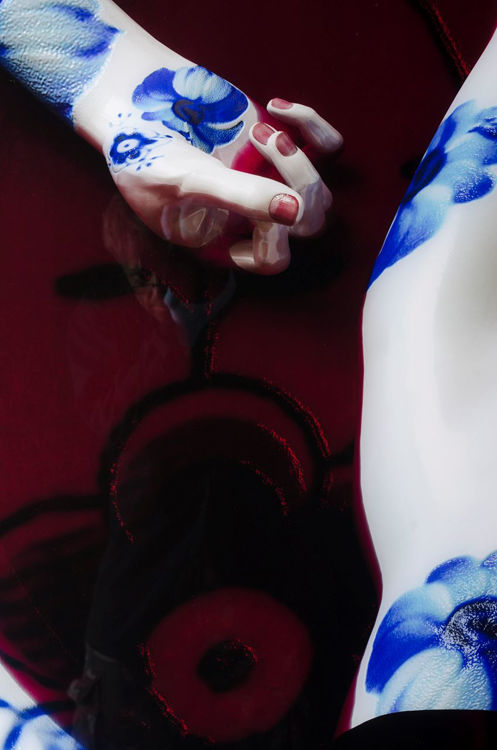 Joon explores the tattoo as a signifier for deeper avenues of identity — either as a vehicle for forming or furthering it, or simultaneously suppressing and subconsciously revealing agency in interplays of desire and fantasy. ‘Drunken - Royal Copenhagen’ is of a series of work which explores the theme through a combination of 3d modelling and renderings of porcelain in eye-popping, violently pop-culture referencing style, the co-option of the Royal Copenhagen “Blue Fluted” motif mirroring and subverting the origin of identity, first developed as a 17th century Western response to Ming and Qing dynasty porcelain design.