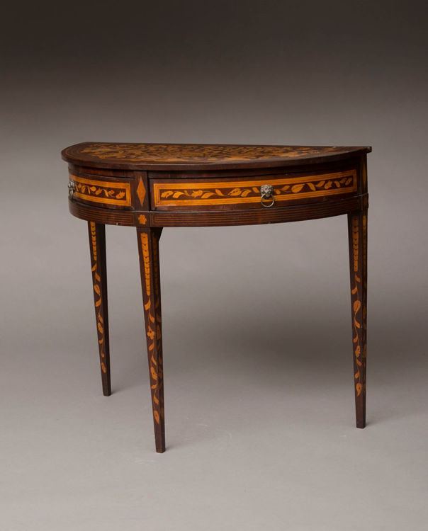 Dutch Marquetry Table, late 18th/early 19th century, demilune mahogany table with inlaid foliate marquetry, swing-out drawers, square tapered legs, and later lion head ring hardware, ht. 28 1/2, wd. 38 1/2, dp. 16 1/2 in. Good condition, some nicks, scuffs, and signs of wear consistent with age and use.
