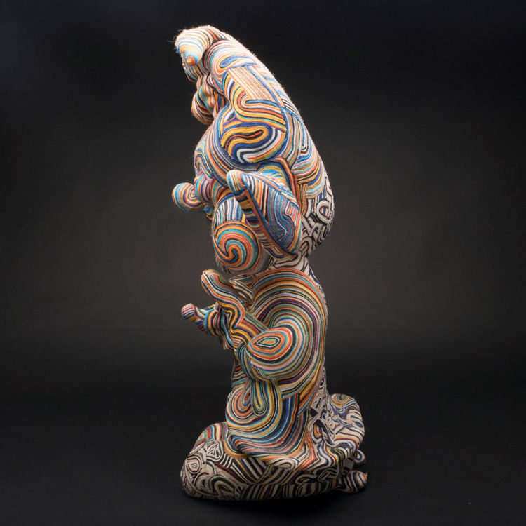 Lucero is as renowned for his painterly abstractions and surrealism as his ceramics, and ‘Elf With Puppy’s striking appearance finds itself in the shock of colour applied in underglaze and sgraffito as a skin. Lucero’s common interest in colliding elements of pop & surrealist art lends an air of plasticky unreality to the piece, the childish appeal of the elf and its kitschy, “yarn-covered” Lambie-esque finish looks as though popped fresh out of a cartoon — the rounded, bulbous ceramic form impressive for resting such a large squat head on a slight body. His practice with clay has been cited as fine art reflected at a larger and more fluid scale, incorporating and evoking archaeology, home crafts and overlooked portions of folk art or popular culture.