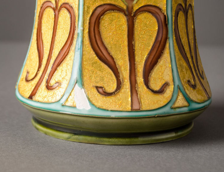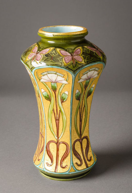 Rare faceted ceramic vase enamel-decorated with carnations and butterflies.
