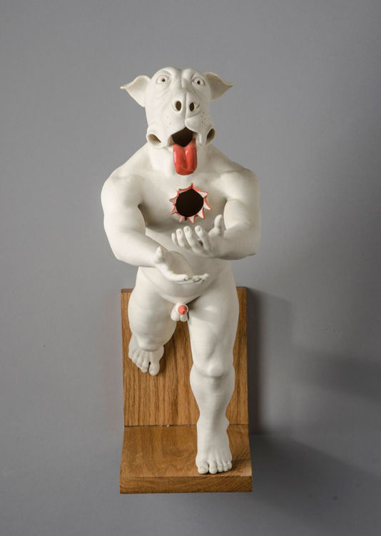 Satiral, gaudy; the work of Russell Biles has as much in common with a cheap souvenir as a sculptural artefact — levelling culture to take even swipes at celebrity, religion and politics. ‘Billary' riffs on the inseparable identity of the clintons, the slip cast figure literally joining the two as a totemic icon (traditionally emblematic of a specific tribe) hilst simultaneously suggesting that one is forever wearing the other as a token of identification.