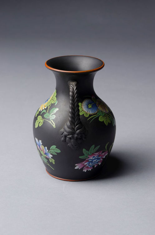 A black basalt vase competed in the 19th century and in the Portland vase silhouette with floral decoration often used by Wedgwood towards the latter part of his career. Josiah Wedgwood introduced into production a black stoneware body in 1768. The first trials for Wedgwood's new black body had begun by July 1766, even before the move to Etruria. By September 1767 his experiments were at an advanced stage, ready for production, and less than twelve months later black basalt wares were on the market. He called it ‘Black Basaltes'; we know it as black basalt. Made from reddish-brown clay which burned black in firing, this ceramic body was superior in its appearance to the local 'Egyptian Black' wares produced in the area prior to that date. It was originally designed as a smooth surface for holding decorative application with inspiration from classical “Etruscan” (Greek or Italian) vessels set across a number of private English collections, but the popularity of the style has meant a wide application of ornamental designs over the companies history.