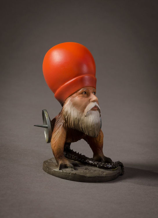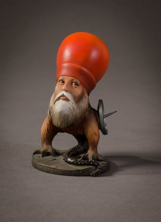This sculpture adaptation replica, Freak with Beard Tail and Tacks Statue, from Bosch's Last Judgement painting appears in the middle panel of the triptych. It shows a rillo with beard, a freak with merely a head and legs. Bosch has extended his interpretation of a rillo by adding the tail of a reptile. He looks with a frightened expression at the mincer, where sinners are put through on Judgement Day. It is an astounding creation in 3D of Bosch's 2D figure from the Northern Renaissance.