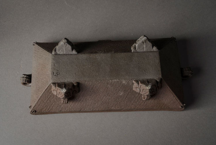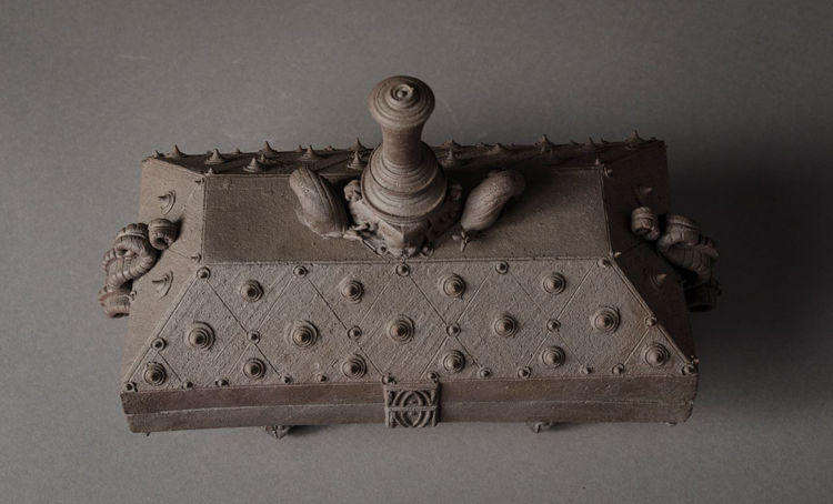 Harris’ ceramics are semi-fictional representations of the artifact, translating a sense of mystery and exoticism — as well as intricate beauty in design — to representations such as “Gastropod Fu”. A use of clay to represent metalwork developed from a technique known as reduction cooling, where the glazing process is bypassed to leave an sharp and rough exterior surface that appears akin to wrought iron. Such a transmutation offers the chance for reinterpretation and recharacterisation of ancient symbols Harris lifts from specific reference points, giving them contemporary logic.