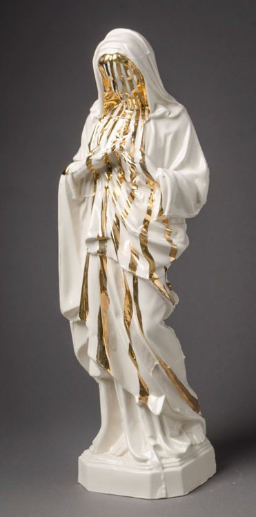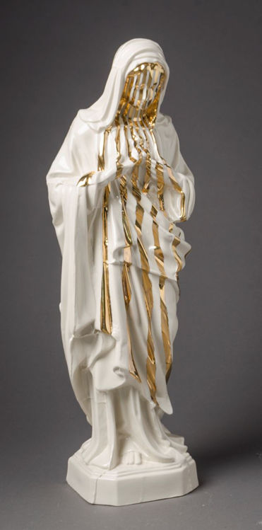 Macpherson explores identity, navigating it through our relationship to the body and the restriction and self-imposed withdrawals away from its physicality and reality. Brought up catholic, her work utilises formal elements and icons from the religious movement — dissolving their original intent through manipulations and processes such as molding and recasting. “Antipodes” namesake is the diametric opposite of a position on earth, and Macpherson finds a lyrical metaphor for characterisation that is at once opposite and bound together — casting two versions of the madonna then fastening them together at the base. Through this the odd unbalancing of the sculptures gait (assumedly added or astutely observed by the artist) finds a new harmony and balance. Small sections of paint applied to the few uncovered parts of the body seem to heighten a sense of opposition, but the palette of red & black neutralises and shrouds any intent for complete contraposition.
