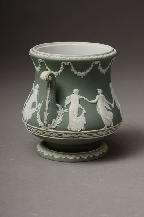 Green Jasper Dip Tobacco Jar with cover and white bas-relief of the Dancing Hours, 1906. The design of the relief is one of Wedgwood’s best known and well loved, depicting the Horae (personifications of the four seasons and main points of time in the day in greek Mythology) dancing hand in hand across the surface. England, 1906, scrolled handles, applied white Dancing Hours in relief below a border of floral festoons, impressed McVitie and Price 1906 and factory mark, ht. 7 3/4 in.