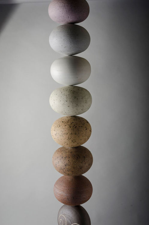 Shaner’s use of earthenware examines material origin, the artist meditating and focusing on the geological foundations under which the substance exists, so as to recall nature in each of his non-representative sculptural acts. The “Hanging Landscape” is a series of simple spheroid clay forms, each segment quietly and elegantly resolved then strung up and suspended sequentially. However, through acts of reference — as well as delicate use of relationship in terms of colours and textures found in startling and intelligently utilised natural processes — a notion of the land is poetically built almost like the sedimentary layers of earth itself. Hanging landscape, Big Fork, MT, 1994 Glazed and incised stoneware, steel cable Chop mark to several pieces 65" x 5 1/2" Provenance: Purchased from the artist.