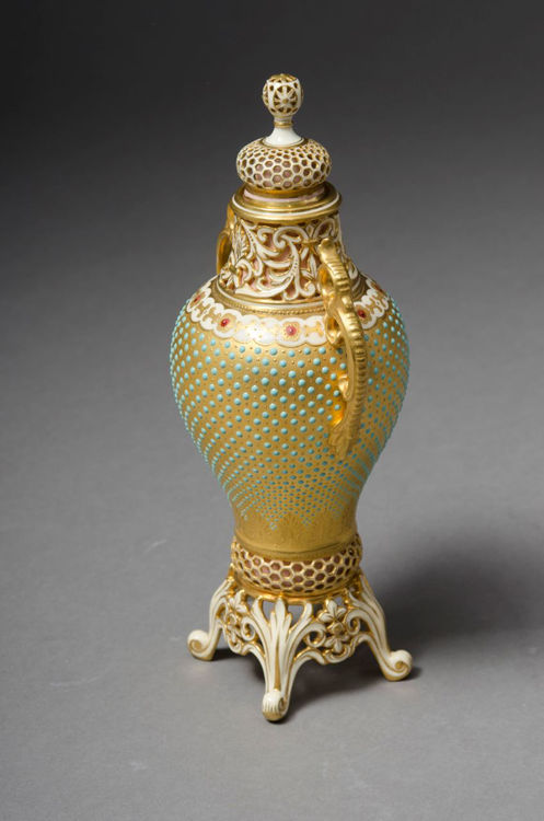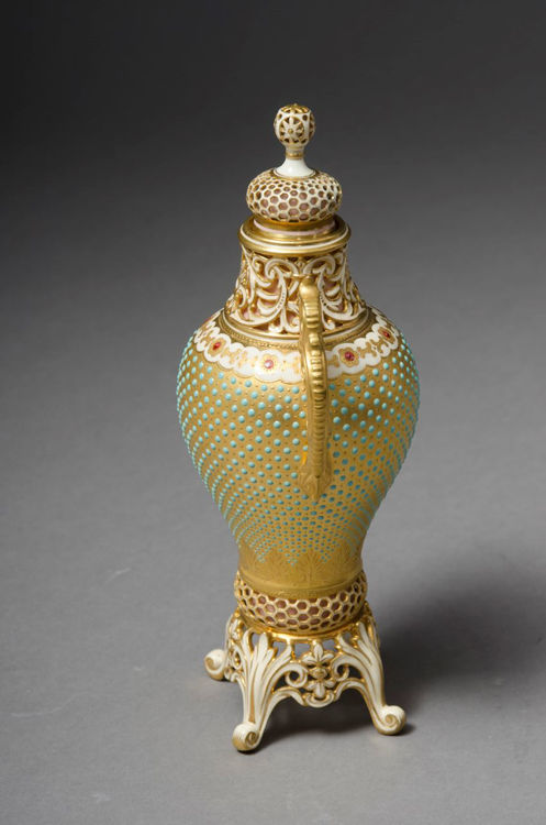Jeweled Coalport Porcelain Vase and Cover, England, late 19th century, with scrolled handles and double wall cover, neck, and foot, red enamel jeweled border above turquoise jeweling to a gold field, pierced and scrolled foliate base, printed crown mark Area of cellwork to cover restored on one side. No evidence of any pitting or loss to jewels.