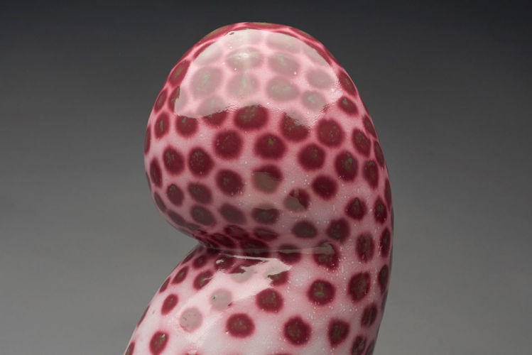 Natural and alien collide in Kwong’s biomorphic sculptural composition “KERMES”, the artist uncovering a world of creatures that seem to defy earthly bounds but which are heavily inspired by and indebted to the remarkable forms of microbiology. “KERMES” has a curious rearing movement upwards, the form finding remarkably and affectively personable countenance with the most minimal of details, and single skin forming an unbroken surface on which violet pink glazes sit. The creature’s artifice of personality, strange unreality, and overall elegance in form play upon the viewers inquisitiveness — reminiscent the vivid colours used as a warning for toxicity or danger in wildlif Stoneware, glaze, Hand Built.