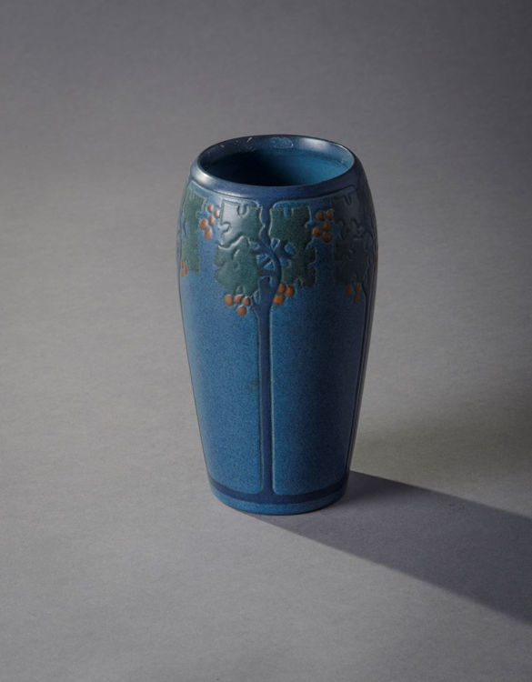 Marblehead vase, tapered shape with carved stylized trees against a blue matte background, marked