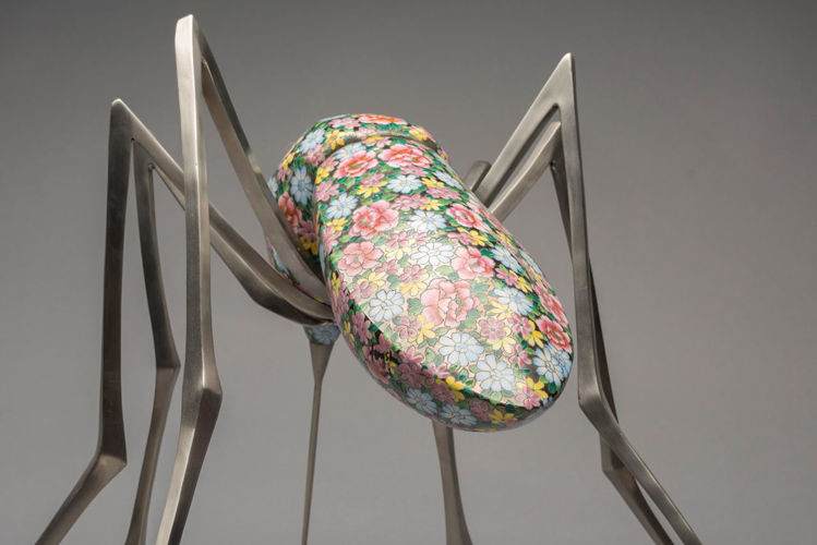 ‘Mosquito’ is typical of Feng Shu’s interest in capturing the likeness of insects in porcelain — a relationship that the artist tracks back to growing up under China’s One Child Policy, and the loneliness culminating in time spent outside looking for insects to amuse him. The work is particularly sharp and balanced, the ceramic defying typical limits and delicate boundaries to reflect the fragility and needle-like keenness of the insect. A green patterned print adds a decorative complexity, and the steel and overall stature of the object — scaling up the insect significantly —suggests some kind of mutational or science-fiction-like evolution.
