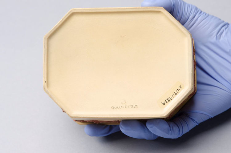 Early 19th century Wedgwood box, in Caneware with applied Rosso Antico fruiting vines in relief. The tan-coloured, unglazed stoneware was relatively rarely used for decorative or display objects over the period, more commonly used for cooking utensils or serving dishes — particularly a selection of game pie dishes — as Josiah Wedgwood recognised the ware’s potential for simulating an impression of pastry crust. Provenance: Property of the Saint Louis Art Museum, Sold to benefit the acquisition fund. One corner of box professionally restored. One saucer with slight rim chip.