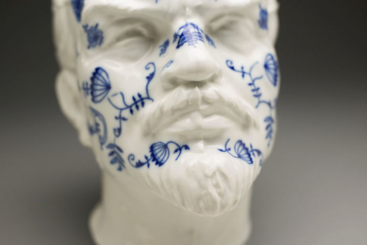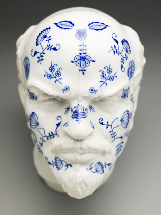 An unfamiliar merging of two memorable entities from Valcovsky’s childhood within the Czechoslovak Socialist Republic, the delft — or ‘blue onion’ — pattern sits awkwardly on the iconic bust, as though tattooed. ‘Ornament & Crime’ hints at how an infamous icon can become remarkably commonplace and ornamental in universal usage, Lenin’s fearsome reputation distilled down to a decorative element that sits alongside the earthenware upon a mantlepiece. The title is a tongue-in-gesture to the work of Adolf Loos, deriving from his 1910 lecture that attacked ornamental works of art in modern society.