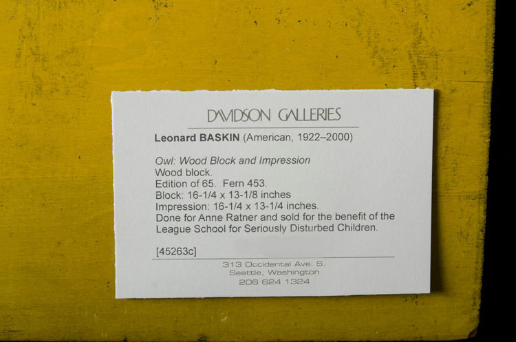 Baskin forms a narrative that cycles around subjective constants: local and ancient mythologies, animal and figural depiction, folk-like engendering and interpretation. The owl of this woodcut finds a gnarled, elongated form from the artist’s hand, a depth of focus put into the roots and curls of the talons, whilst the prevalent wise wide eyes—and the entirety of the head itself—are almost entirely obscured in an impressionist flurry of stroke and feather.