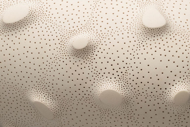 Lambe’s harmonic combination of natural and sculptural provides her ceramic a gentle abstraction — the texture and dynamics of ‘Raised Oval Song’ relatable to the odder persuasions of oceanography or animal evolution, and tussling with a state of real versus unreal. The off-white ceramic skin of the pebble-like shape is rendered with a multitude of corralled extrusions and pin-prick whorls, the surfaced smooth and rolled as though picked from a shore.