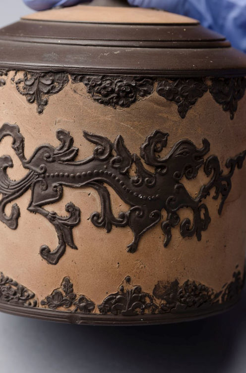 Mid-18th Century Redware Teapot with cover. The cylindrical body, stylised spout and handle — shaped to resemble bamboo — and glazed black dragon relief over a lighter buff indicate a purveying Chinese influence designed to appeal to the collector.
