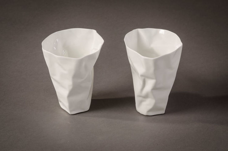 Xie Dong only sought to work in porcelain after noticing the beauty in the wrinkles and folds of a tinfoil chocolate bar wrapper, translating those ephemeral qualities to ceramic — a more permanent but naturally fragile and delicate looking cross-medium. The use of Bone China, made locally, means the china retains a translucent, ivory-coloured quality once fired, and these ‘Zhezhou’ or ‘Wrinkle’ cups intentionally impress the texture, creases and elusive dynamics inherent in tinfoil.