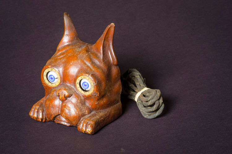 The Duke dog's head electric rolling eye clock, Chicago, IL, wood composite, glass, applied manufacturer's plate, 5 3/8"w x 4 1/8"d x 6 3/4"h