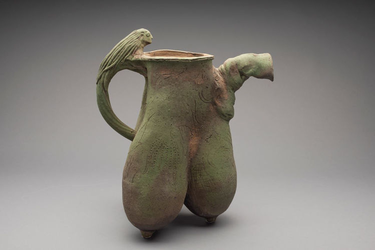 Ken Ferguson (1928-2004) was a ceramicist best known for creating vessels with animal or anthropomorphic qualities included in the form. ‘Triple Udder Mermaid Vessel’ hybridises several figural and animal quantities into the body of a pouring jug, the inflated stature of the feet shaped to reflect breasts or udders and combining with the mermaid handle as a symbol for mythic or folk-like femininity. The vase is covered with a verdigris and gray dead-matte volcanic glaze that adds solidity and a sense of rough, earthy tactility.
