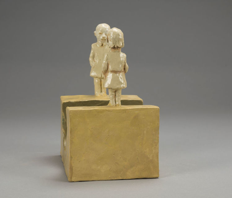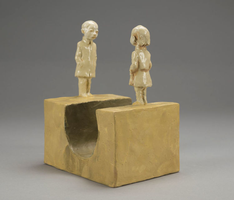 Novak’s “disfigurines” reposition the historical context that ceramic classically retains — investing in a traditional western, bourgeois perspective and then subverting it to introduce a fresh and often haunting model. ‘True Love’ finds sentimentality at a difficult axis, the central form stripped of any notion of decoration or presentation for a simple, rough block of clay — the peeking rodent implying a gutter or trench cutting through. Two figures, male and female, stand split by the gulf; separated but in tune.