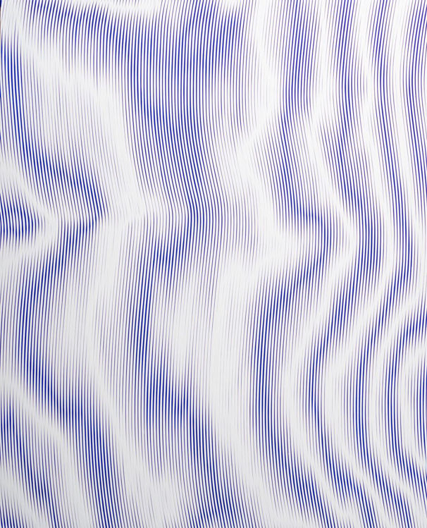 Op-art complexity and a shifting textural plane finds New Yorker Abrahams painting as a way to destabilise and redirect the viewer, the high contrasts and optical collisions conveying a sense of movement and dynamism that leaves a unique impression upon an individual. This piece breaks (comparatively) free of the grid and towards a massaging, wavelike composition, each hazy band forming and breaking in careful deployment of vertical strips of paint in varying thicknesses.