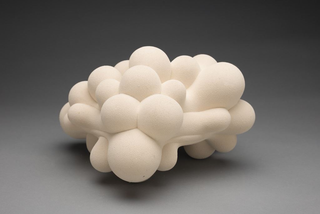 The result of studies into the dynamics of sense of movement conveyed in single, resolved forms — this untitled piece conveys fluidity in a remarkable use of porcelain. Appearing soft and foamlike, Lund intends the shape to shift in proximity, appearing spontaneously or meticulously arranged as the viewers focus switches. Her continued use of ceramic comments on the material’s fragility and ubiquity, and the potential it holds for creating something unexpected.