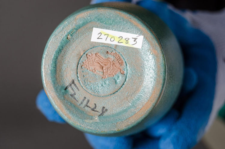 Vase painted with lotus in cuerda seca, Boston, MA, ca. 1925; Paul Revere Pottery medallion; 6 1/2" x 3 1/2";