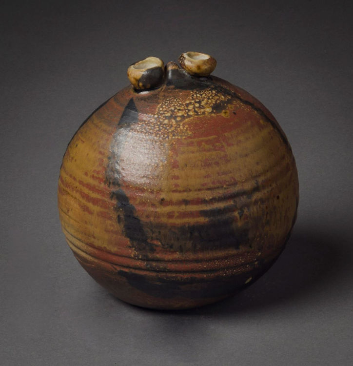 Takeuzu’s ceramics explore closed cylindrical or spherical vessels, so called “moons” that explore the interior and exterior surface and form poetic mirrored relationships to the body — often resembling or closely inferring the heart or soul-as-organ, and particularly reinforced by the inclusion of a small bead of clay wrapped in paper before sealing to rattle around in the interior space. This jar is sealed a slightly squat form, its surface treated for a depth of texture in firing — then finished with a cobalt glaze.