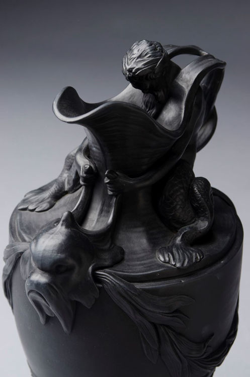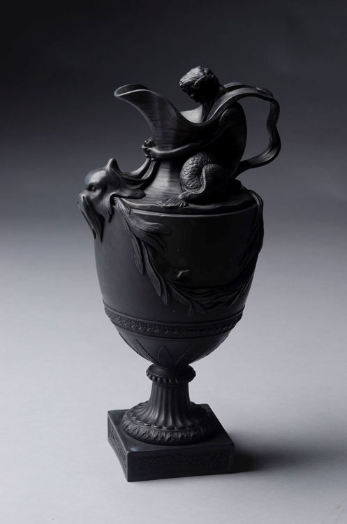 Two Wedgwood Black Basalt Water Ewers, England, 19th century, each with Triton seated atop the shoulder and modeled holding the horns of a marine monster below the spout, foliate swags to either side, impressed marks, ht. 15 1/2, 15 3/4 in. Provenance: Property of the Saint Louis Art Museum, Sold to benefit the acquisition fund. Each in very good condition throughout with no evidence of any cracks, chips or restorations.